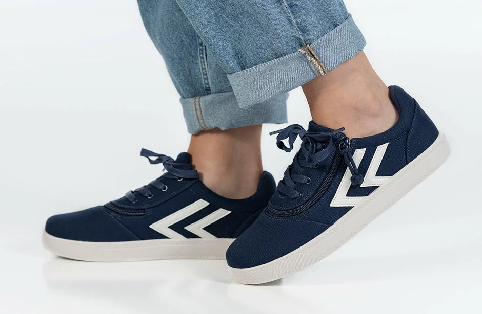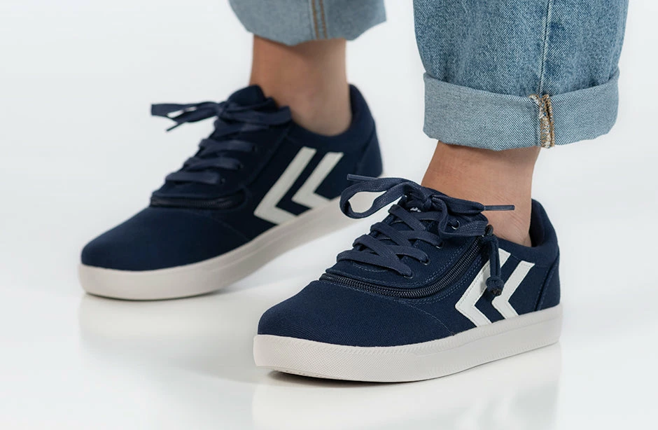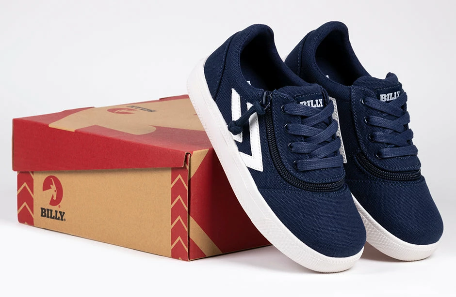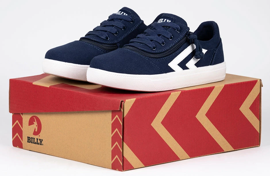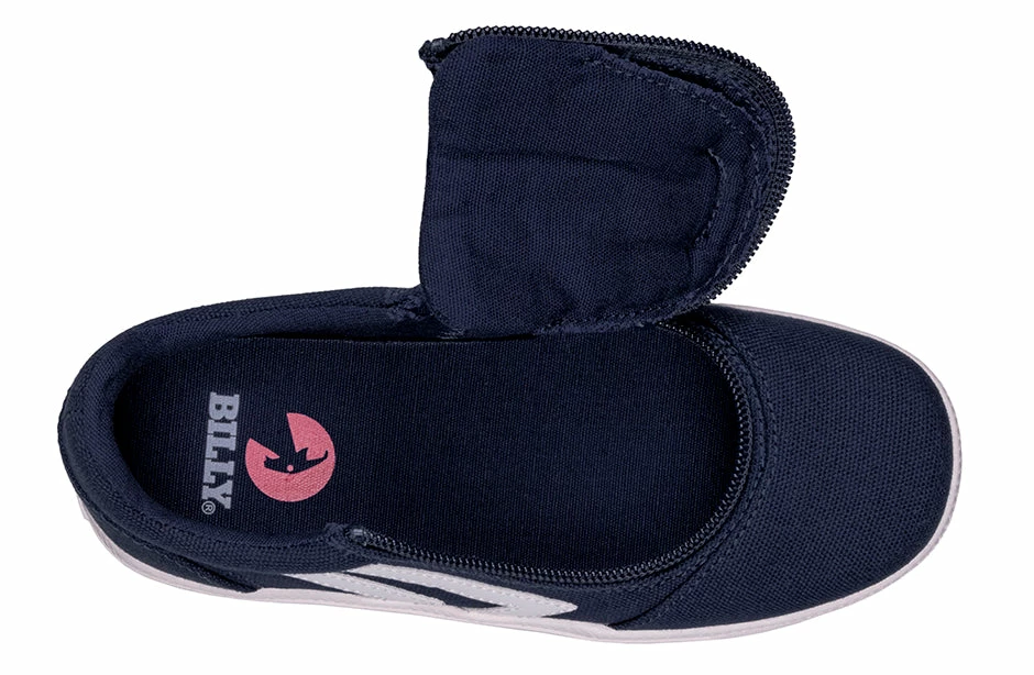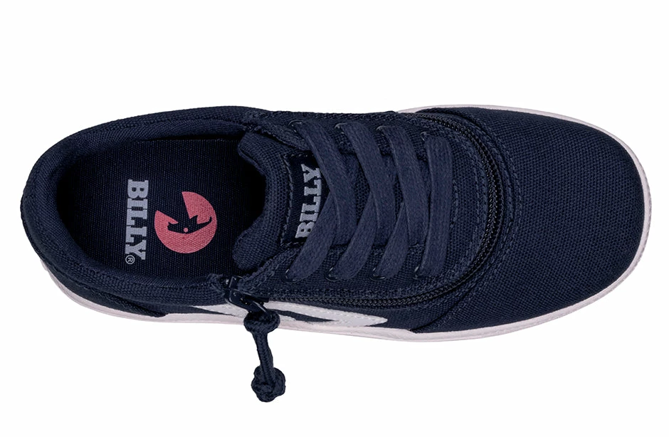 Inspired by a core-skate look, the Navy/White BILLY CS Sneaker Low Tops are sure to deliver. These trending kicks embrace nostalgia, yet remain true to current style. Coming with functional laces for a custom fit, removable insoles for added depth, and a wraparound zipper for unmatched convenience, your kiddo is going to feel good when theyย Step In!
