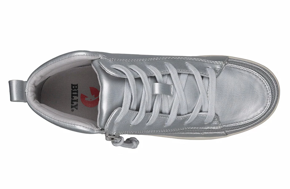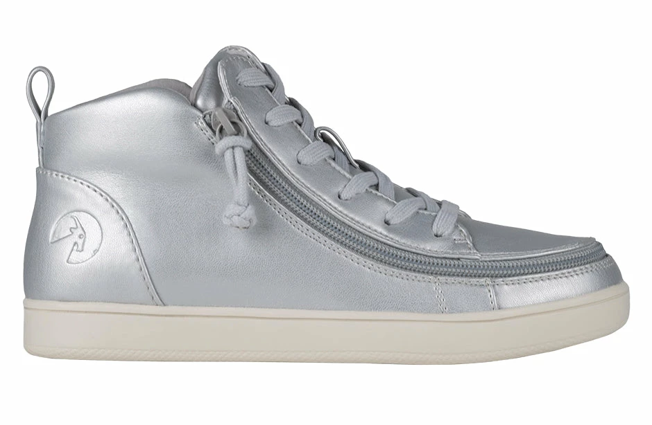 A classic look with universal style. Combining fashion with function, Step In! to your shoes unobstructed in seconds. These faux leather Women’s Silver Grey Metallic BILLY Sneaker Lace Mid Tops have a soft feel and padded collar for extra comfort. Use the functional laces to get the fit right, and then use the wraparound zipper henceforth.ย And with the multi-density foam and silica gel insoles, you’ll have cushion where you want it and support where you need it. Enjoy!